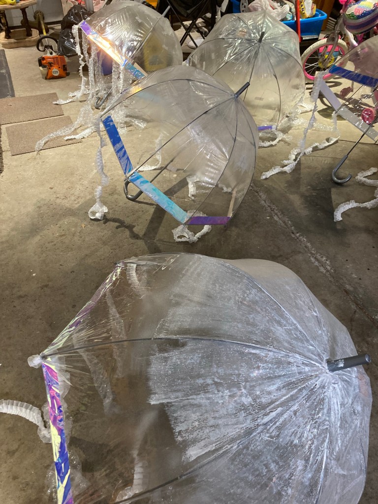 Starting with the clear umbrellas, adding the battery operated LED lights with clear packing tape as the adhesive. From there I added iridescent duct tape to the outer edge. My goal here being that I wanted the umbrella to be collapsible post transformation. Alternating, I added 24” white organza to half the umbrella support edges. Again clear packing tape – the EXPENSIVE 3M heavy duty- is the best adhesive here to the vinyl and fabric. For each umbrella section – these had 8 sections- I cut two long stripes of iridescent curly ribbon (arms length) and two long strips of bubble wrap. For the bubble wrap tentacles, use the tape to sporadically tape onto itself- making more of a tentacle shape rather than flat laying bubble wrap. I did two pieces of tape to each bubble wrap piece here. Additionally with the bubble wrap and curly ribbon, I added a piece of white netting; tied with two knots a piece to also create movement and texture. Each umbrella has 44 tentacles (16 bubble wrap, 16 curly ribbon, 4 white knotted netting, 4 white organza).